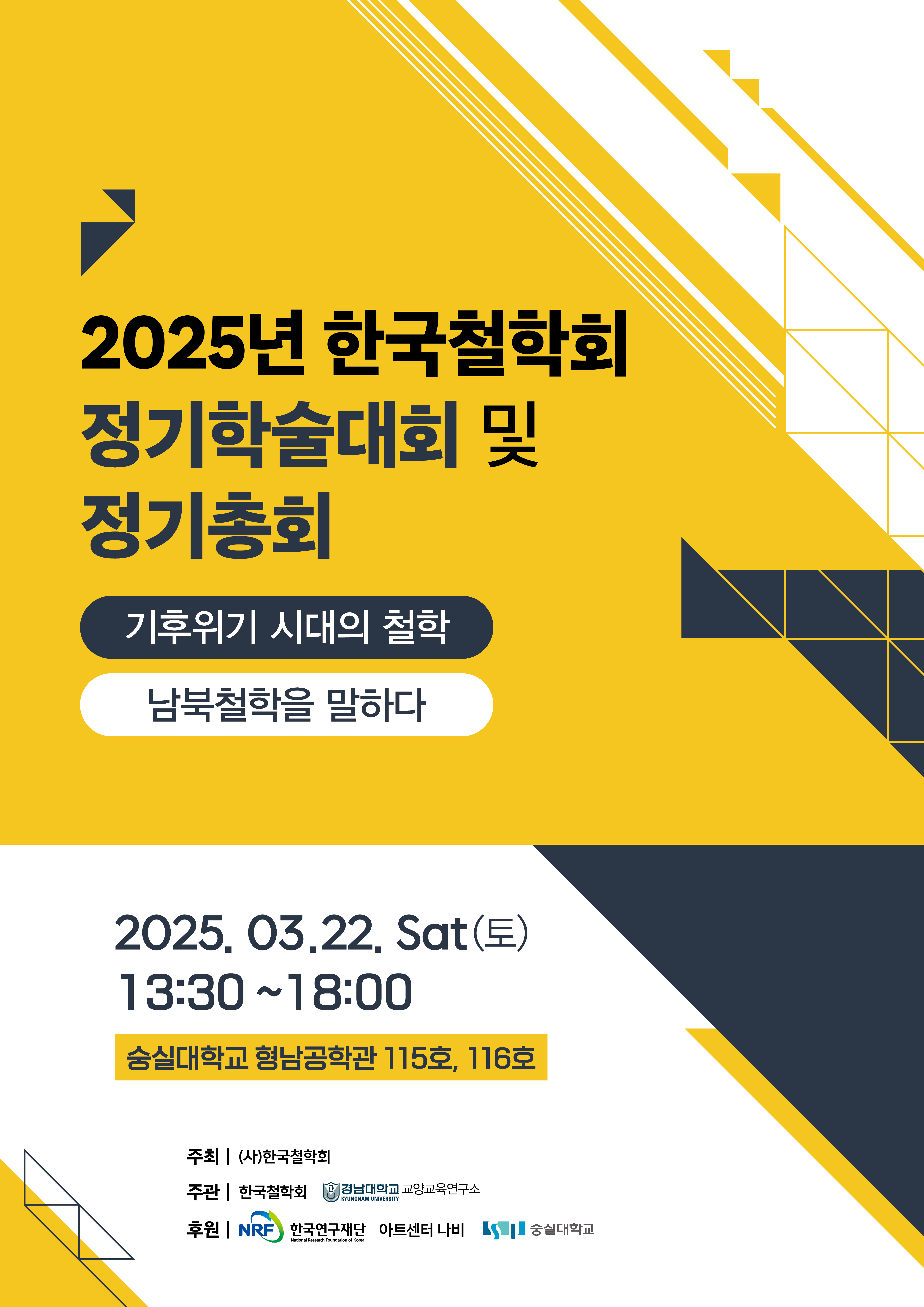 한국철학회 정기학술대회 및 총회가 2025년 3월 22일(토)에 숭실대학교 형남공학관 115호, 116호에서 개최될 예정입니다.