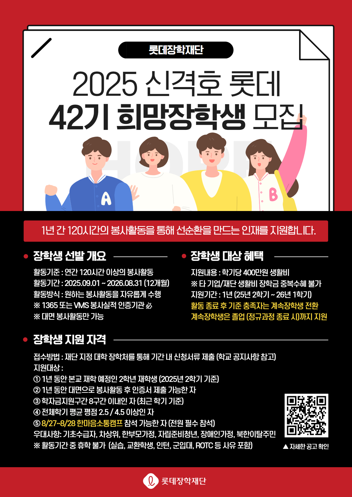 [2025학년도 2학기 롯데장학재단 42기 희망 장학생] 선발 모집 안내드립니다.
