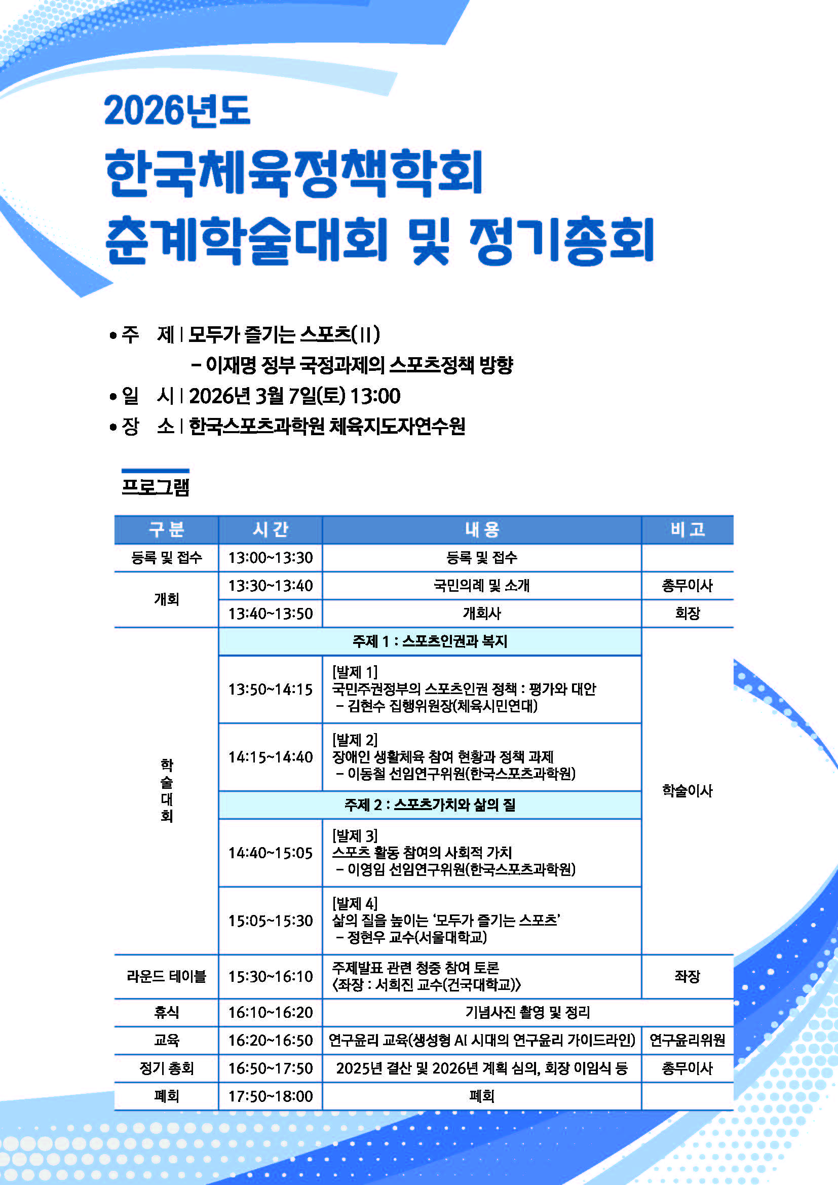 [행사] 2026년도 한국체육정책학회 춘계학술대회 및 정기총회