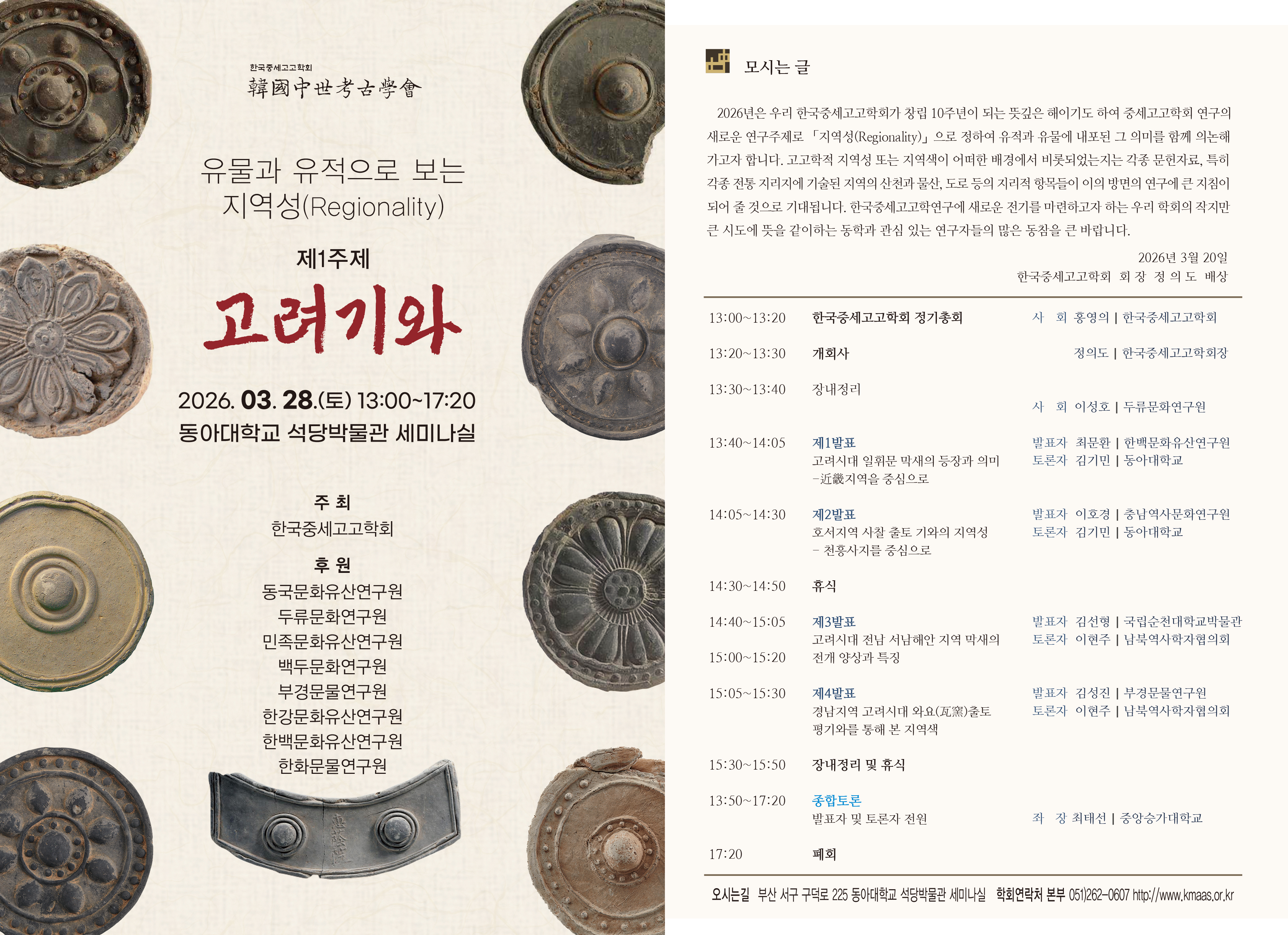 우리 한국중세고고학회에서는 2026년 춘계학술대회를 시작으로 지역성(Regionality)이라는 주제로 다양한 유물과 유적을 검토하고, 이를 통해 지역적 전통과 변화 배경에 대하여 살펴보고자 합니다. 우리 학회는 고고미술사 연구의 거대 주제인 지역성이라는 주제를 부각시킬 수 있는 유적과 유물을 선정하여 정기학술대회를 이어가고자 계획하고 있으며 그 첫 번째 기획으로 유물과 유적으로 보는 지역성」 – 1주제: 고려기와2026년 춘계학술대회를 개최합니다. 이번 학술대회에서는 지역성이라는 관점에서 고려시대 기와의 형식 변화와 제작 기법 및 사용 양상의 특징을 중심으로 지역적 차이를 탐색하고 그 차이가 내포하고 있는 의미를 고찰하는 자리가 될 것으로 기대됩니다.